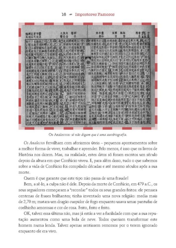 Impostores Famosos parece um livro cheio de criminosos e delinquentes, não? Pois, mas não é. Por estas páginas vais encontrar alguns dos nomes mais conhecidos da História – e não pelas melhores razões. Este livro explora o lado oculto da História e vai fazer-te pôr em causa tudo o que sabes sobre os mais ilustres. Segue as vidas falsas de doze figuras que mudaram a História e descobre tudo o que foi inventado sobre os famosos (e sobre alguns que deviam ser famosos)!