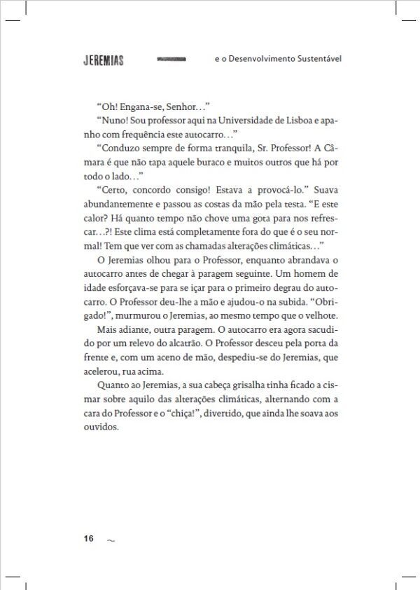 Vão conversando sobre as alterações climáticas, o ambiente e a energia. Pouco a pouco vão percebendo a importância das escolhas que todos têm de fazer para se poder caminhar rumo a um desenvolvimento sustentável. Temas muito complexos e atuais, e conceitos fundamentais da física, da energia e do clima, ficam a parecer simples e ao alcance de todos, através das explicações vivas e esclarecedoras do Professor, em diálogo com os seus interlocutores. A Rita e o João percebem que a escolha do curso universitário que estão em vias de fazer vai mesmo ser nos temas do clima (Rita) e energias renováveis (João). O próprio Jeremias aproveita a sua saúde mais fragilizada para antecipar a reforma e enveredar por uma ocupação em torno de uma atividade de reciclagem de comida, com um forte cariz social. Perspetivam com entusiasmo um futuro diferente, agora mais conscientes de que esse futuro, sustentável e de todos, está fortemente dependente do seu empenho e atitude.