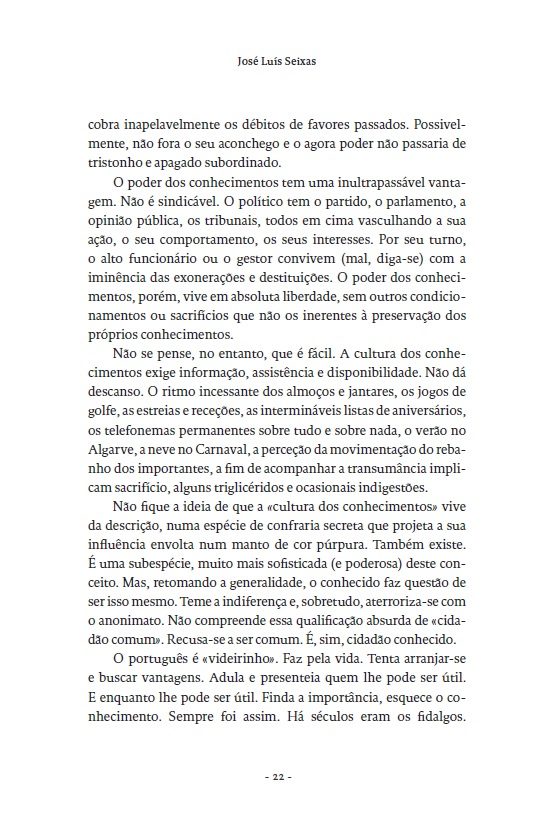 O olhar inaugural é sobre os vícios nacionais, «quiçá genéticos», reserva opinativa que nos responsabiliza, se começarmos por combater a corrupção, «mal endémico» (p. 21). Já em 1950, nos Elementos Fundamentais da Cultura Portuguesa, Jorge Dias alertava para essa mania de sobrepormos a simpatia humana às prescrições da lei, aqui dita «cultura dos conhecimentos», em que se é importante por conhecer alguém importante, de quem se espera favor. Na segunda crónica, os títulos académicos e dignidades inserem-se numa preocupação verberada desde o século XVII, dentro desse gosto pela ostentação que revemos nas “Conversas de senhoras de bem”: «Atrás de mim, três senhoras com indeléveis quatro decénios vividos, de aspeto finíssimo e oralidade afetada, atacavam esfaimadamente uma salada, verberando, com ciclópico entusiasmo, os similares comportamentos abandónicos dos seus respetivos maridos. Deglutiam alface frisada e tomates geneticamente diminuídos e diziam dos consortes o que Costa não diz de Seguro» (p. 25), etc.